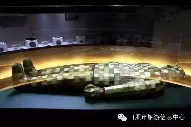 金缕玉衣——据考证墓主人是东汉时期的第一位城阳王刘祉。全身共有2000多片玉,现在我们看到的只有腹部发黑发暗的是原件,其它的是用莱州玉修复上去的,用铜丝代替了金丝。在汉代,崇玉厚葬达到了无以复加的地步,汉代人认为玉是“山岳精英”,将金玉置于人的九窍,人的精气不会外泄,同时,玉片本身发凉,人们就认为它能够保存尸体不容易腐烂。可求来世再生。金缕玉衣是汉代皇帝和高级贵族死时穿用的殓服,外观和人体形状相同。根据当时的等级不同,可分为金缕、银缕、铜缕三个等级。到三国时期,魏文帝曹丕即位后即下令禁止使用玉衣,从此玉衣在中国历史上消失了。
