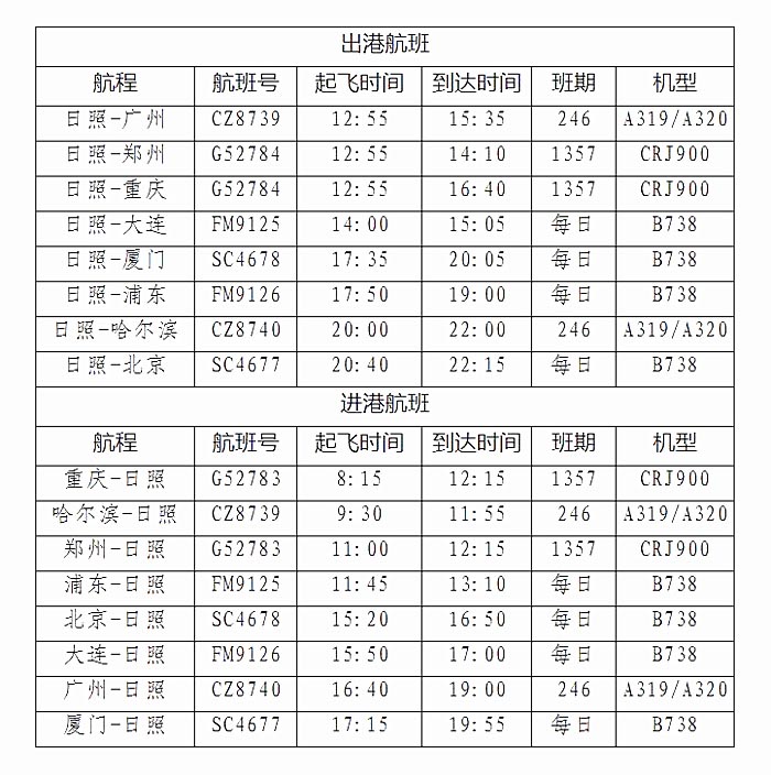 附:日照机场夏秋航班表