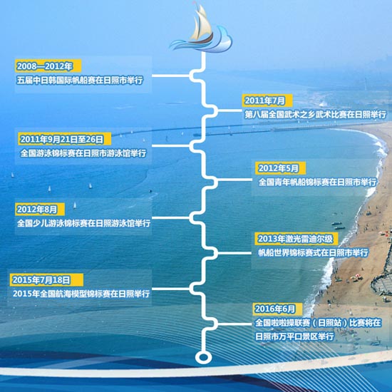 近年来,日照市高度重视体育事业发展,充分发挥自身优势,突出打造水上运动之都城市品牌,依托功能完备的世帆赛基地,先后承办了60余项国内外重大水上体育赛事活动,积累了丰富的竞赛组织经验,成为开展水上竞技运动、水上休闲旅游和水上科技教育的理想之地,赢得了众多国内外体育赛事的主办权,也吸引了国内外众多游客来到这座宜居城市旅游度假。