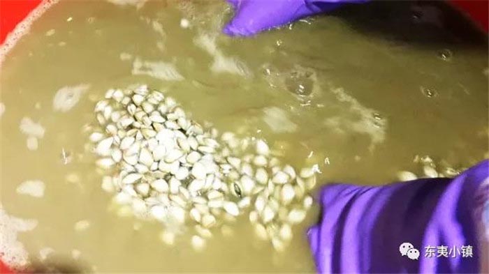 ❥ 继续研捻,再取一个盆,像淘米一样来回淘澄汤汁,把海沙子的外壳淘出将贝肉再用原汤漂洗、除杂,沉淀汤汁。经过这些过程,海沙子就煮好了。