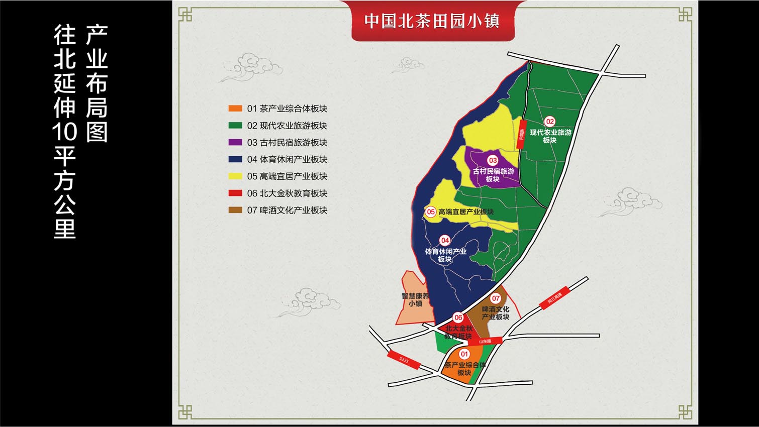 北茶小镇项目位于山海路以南、海曲路以北、改线后的204国道以西、黄山山脉以东,规划面积10平方公里。西邻智慧康养小镇,组成了日照城西特色小镇集群。包含茶产业、教育、现代农业、休闲旅游等七大板块。