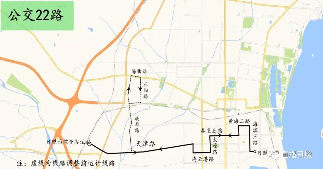 调整后的公交22路途经海滨五路(“山水大酒店”站,步行400米到达火车站)、黄海二路(火车站南站,步行350米到达火车站)可满足石臼火车站及石臼方向乘客往返日照西综合客运站的需求。