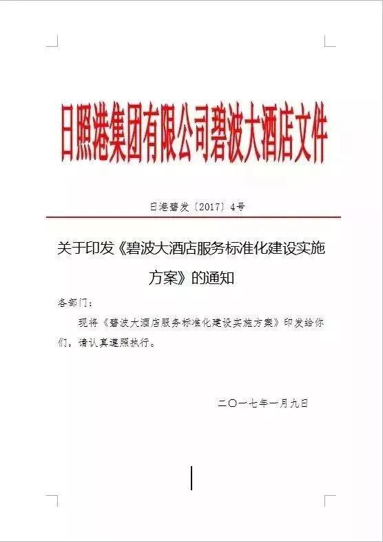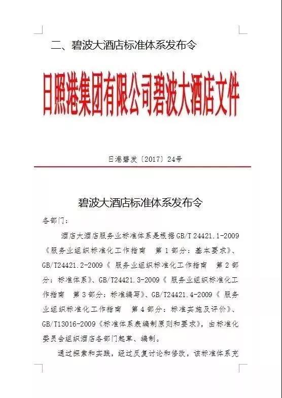 2016年12月,碧波大酒店进行了服务标准化试点建设申请。结合酒店二十多年的标准服务经验,通过体系建设进一步梳理各项服务流程与标准,实现“岗岗有标准规范,人人按标准服务”的全员标准化意识。