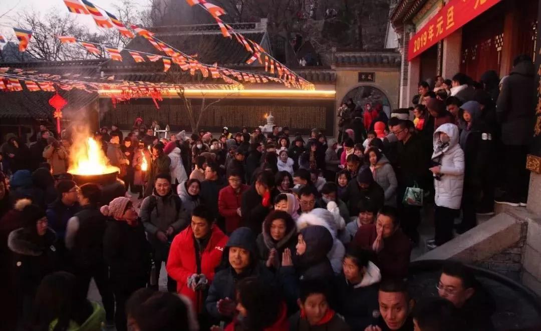 五莲县五莲山风景区举办“元旦祈福·迎接新年第一缕阳光”系列活动,游客在光明寺普诵佛经、传灯撞钟,迎接新年到来。