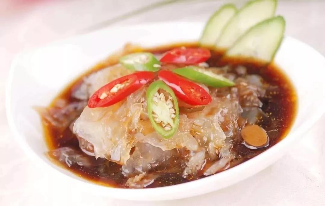 汉族名菜,属鲁菜系,日照特色美食之一。优质白海蜇头,特制醋、清脆爽口。选用上等的特质酱料,色泽透亮,光线在海蜇头间的折射竟使它泛出立体感,端上来时有一股奇异香味扑鼻,咬下第一口,脆生生的,却很厚实,清香从海蜇皮渗透出来,触及唇齿,立刻充盈整个口腔,一番享受后细嚼咽下,一定忍不住夹第二块,回味那淡淡的海洋气息,好吃得没话说,非比寻常。