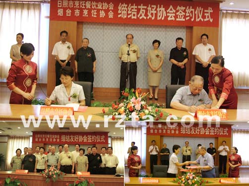 8月26日上午11:30,原山东省政府省长助理、山东省烹饪协会会长孙光远一行、友好地市烹协嘉宾,日照市人大副主任、烹协名誉会长蔡建华、日照市旅游局副局长、烹饪协会会长张荣英,原烟台市委副秘书长、烟台市烹饪协会会长王韶华在日照阳光华府大酒店,举行日照市烹协与烟台市烹协缔结友好协会签约仪式。