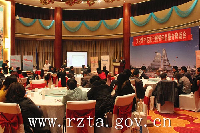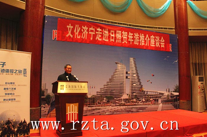 12月10日下午,文化济宁走进日照贺年游推介座谈会在日照蓝海国际大酒店召开。济宁市旅游局调研员杨绪东、日照市旅游局副局长赵志超出席推介会并致辞。推介会由济宁市旅游局牵头组织,邹城市旅游局、梁山县旅游局、微山县旅游局、泗水县旅游局、曲阜市文物局营销中心,曲阜孔子六艺城、兖州区兴隆文化园、邹城孟庙孟府景区、水泊梁山风景区、汶上宝相寺景区,以及曲阜中国国际旅行社、曲阜风光旅行社、汶上神州旅行社、梁山聚义旅行社等20余家旅游相关单位参加推介会。日照市平安国际旅行社、中远旅行社等16家日照旅行社参加了推介会。