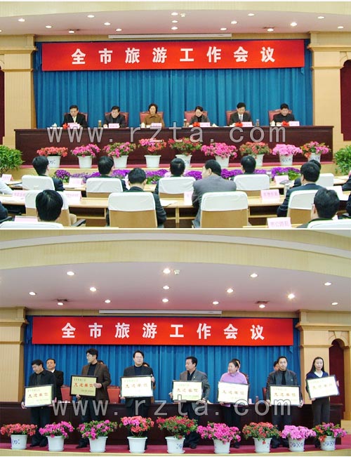 日照市人大副主任蔡建华、市政府副市长徐清、市政协副主席王和田、市政府办公室副主任来永明、市旅游局局长柏峰、市人事局副局长杨猛等在主席台就座。会议由市政府办公室副主任来永明主持。会议总结了近年来,在市委市政府的正确领导下,全市旅游行业广大干部职工解放思想、更新观念、奋力拼搏、真抓实干,推动了我市旅游业更快更好的发展,2005年旅游接待和旅游收入增幅位居全省前列。市人事局、旅游局决定,授予日照海滨国家森林公园等15个单位“全市旅游行业先进集体”称号,给予张锡华等7名同志记三等功奖励,给予王延河等18名同志嘉奖奖励。