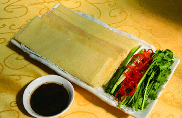 日照煎饼:日照煎饼为日照民间主要食品,主以小麦面粉、红薯面粉、小米面、玉米面为原料,绞成浓糊状,上热并滩烙而成,饼薄如纸,色调微黄,质细香甜,柔软可口。