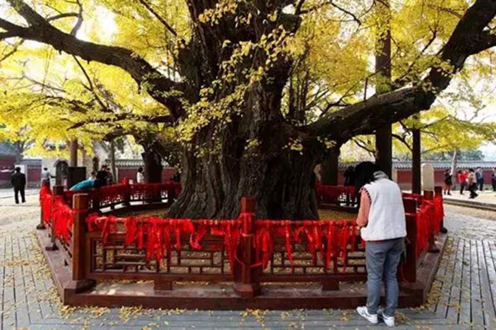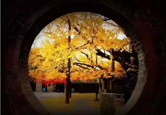 第八怪: 授粉距离百里外 银杏树是雌雄异株的,这棵树是雌树,最近的雄树在西南方向的沂南县境内,离此有60余里,虽然授粉距离较远,但树王每年都硕果累累。
