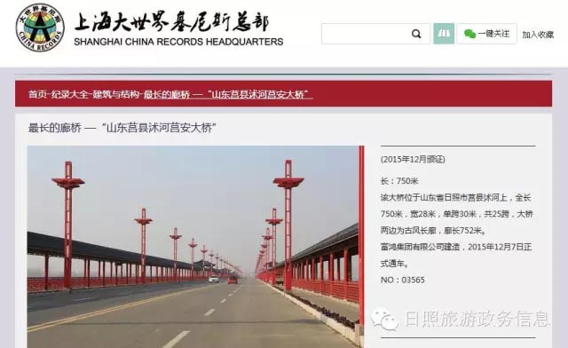 近日,从上海大世界基尼斯总部官方网站了解到,莒县沭河莒安大桥经过上海大世界基尼斯总部严格考核评选,荣获“大世界基尼斯之最—最长的廊桥”称号,成为中国最长的廊桥,并已于2015年12月份颁发证书。
