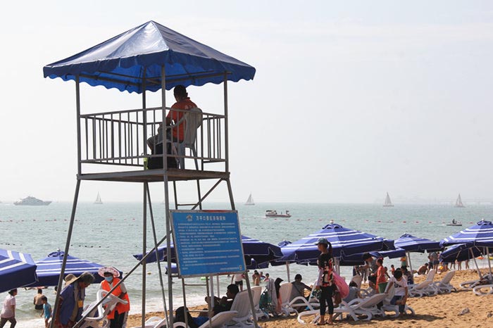 在安全方面,一是全景区配备150余名安保人员,实现24小时无缝隙值班。二是在景区大大小小的重点区域安装了200多个监控摄像头,监控区域覆盖整个景区。通过人防和机房的双重措施,确保游客安全。同时海上救助配备了专业的海上救护人员,加大巡逻力度,加强应急管理,到目前为止,整个浴场实现零安全事故。