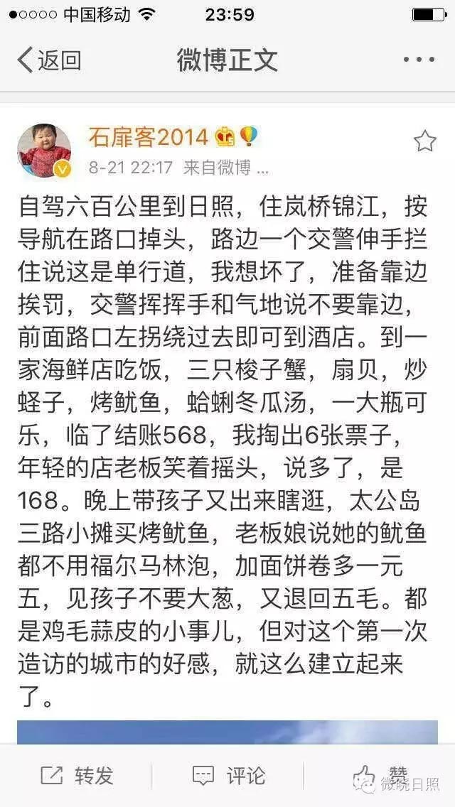 一个外地游客,第一次来日照,他把自己的亲身感受发在了微博上: