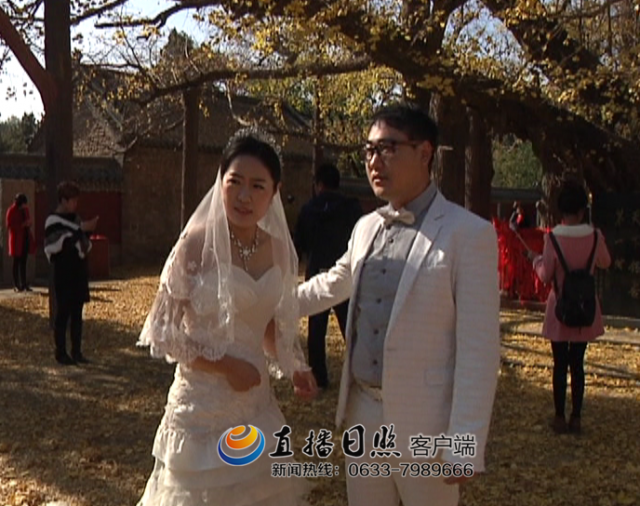 一位准新郎怀着对浮来山银杏树的喜爱和敬仰,带着自己的新娘在树下拍摄婚纱照,希望千年银杏能带给自己好运和祝福。