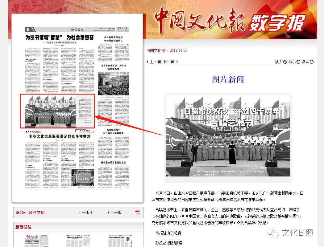 2018年11月5日出版的《中国文化报》在6版刊发了图片新闻,报道了我市举办庆祝改革开放40周年合唱艺术节,以饱满的热情讴歌改革开放40周年,充分展示我市文化惠民和全民艺术普及的丰硕成果。