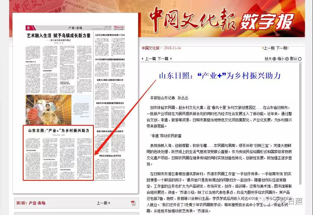 2018年11月14日出版的《中国文化报》在8版刊发了题为“山东日照:“产业+”为乡村振兴助力”的文章,报道了我市通过整合文创、非遗、旅游等资源,鼓励当地特色文化项目集聚化、产业化发展,为乡村振兴带来新思路。