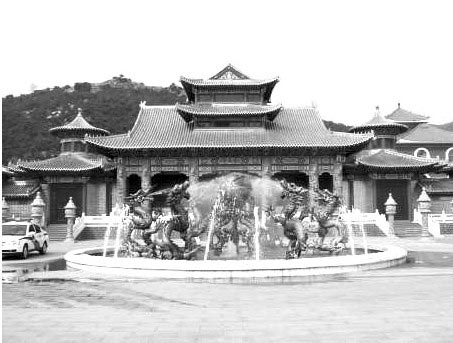 进入景区,经首道“人间仙境”大门下车,进入水竹寨,游览龙、凤、龟、蛇、麒麟五瑞雕塑,中华水乡、千水台,参观全国唯一的金瓦金銮殿、参观九龙吐水冷铜雕塑。经御道过菏池,通过天润亭上石鼓山,在山上听石鼓来历,远眺大海,走山路。