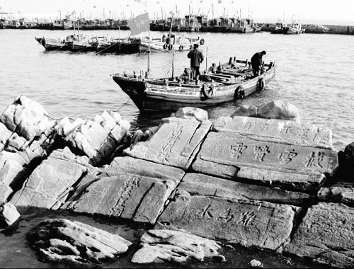 海上碑是我国难得一见的海上摩崖石刻,被誉为“万里海疆第一碑”。此碑始刻于清顺治乙酉年(1645),碑文分别是:横书“星河影动”、“撼雪喷云”(明末苏京题)、竖书“砥柱狂澜”、“万斛明珠”(明末王铎题)、横书“难为水”(清安东卫守备阎毓秀题)。题词字体苍劲有力,用词言简意赅,行文出神入化,可谓石刻精品。碑身因势造形,座南面北,构思巧妙,独具匠心,可谓巧夺天工。另外此碑北为面,观者立于岸上即可读碑文,文中意景与海景交融,引发游人遐思。面北又可减少海浪对碑文的冲击,以保护碑文。故而历经风雨三百六十余年,依然字迹清晰可辨,历历在目。