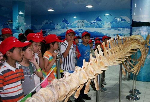 海洋生物馆的标本异常丰富,像鱼类、龟类、贝类等,还有代表南北两极的企鹅标本,以及洁如玉、红似火的珊瑚。在导游细致的讲解下,小记者们了解到了更多的海洋知识。