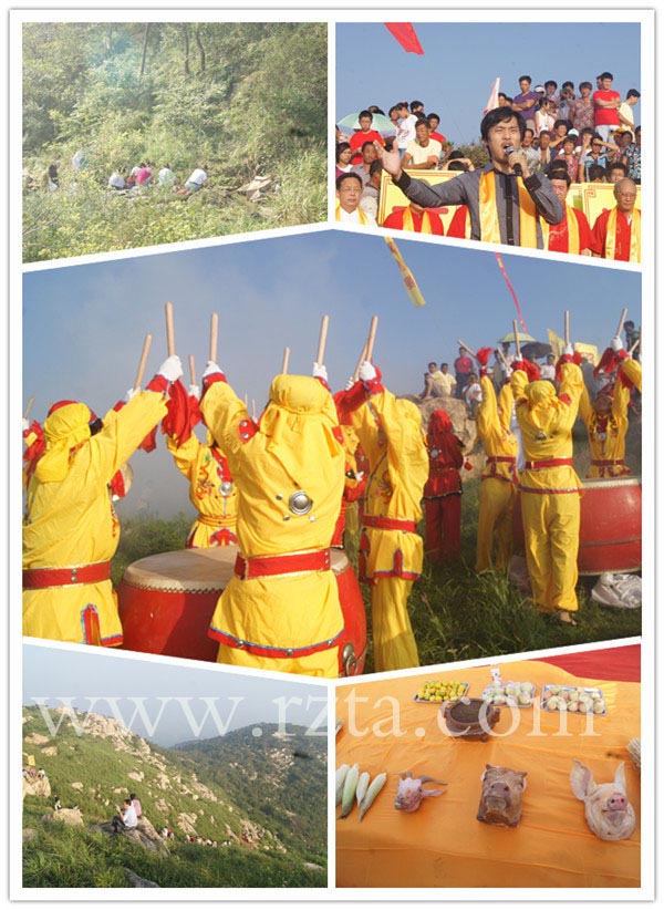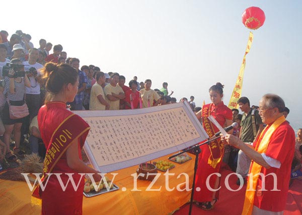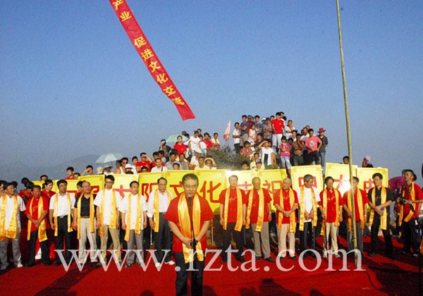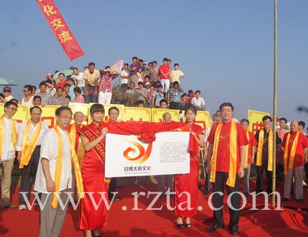 8月6日晨(农历六月十九),日照太阳节祀日大典在日照国际海洋城涛雒镇天台山主峰隆重举行。市政协副主席董全宏宣布日照太阳节开幕,市旅游局局长王立新、国际海洋城工委委员、纪委书记刘兵为日照太阳文化标志揭牌。市旅游局副局长禚磊、刘家湾赶海园管委会副主任秦绪言、涛雒镇镇长孙强、日照太阳文化研究所会长、副会长、顾问、监事人等出席活动。