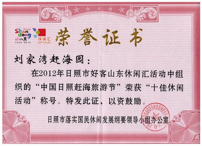 近日,从日照市落实国民休闲发展纲要领导小组办公室获悉,刘家湾赶海园在2012年日照市好客山东休闲汇活动中组织的“中国·日照赶海旅游节”荣获“十佳休闲活动”称号。