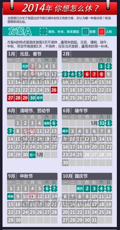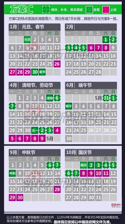 “3个方案中只能选择C了,相对还合理点。”无论是哪种调休方案,休假总数都还是11天。在总数没有变化的情况下,多数网友还是倾向于集中放假的方案三。“方案一没了五一小长假,方案二没了国庆黄金周,显然这两假不能没有,那么只能选方案三。”不过也有市民表示,按照方案三的放假安排,2014年的节假日将和今年没什么太大变化,这样一来这种放假调整还是没有解决大家对现行节假日调休方式不满的问题。
