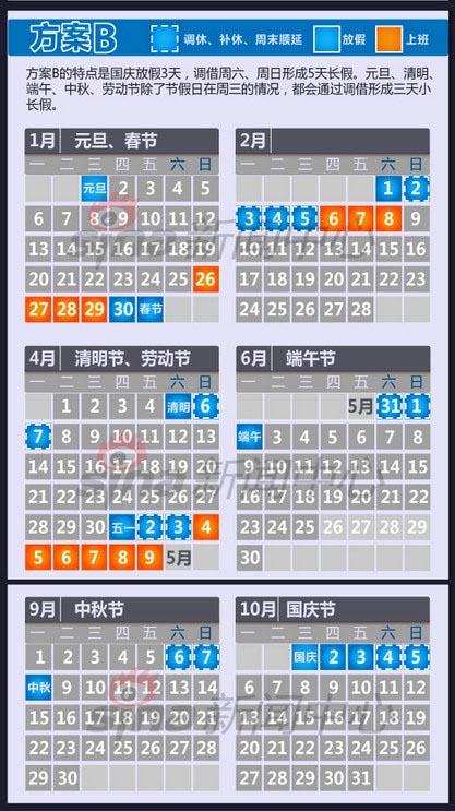 第一套方案给出的休息方式是春节调休后放假7天,其他六个节假日按照正常的公休日来放假,也就是说国庆节休息三天,固定假期是10月1日至10月3日。其他包括元旦、清明节、劳动节、端午节、中秋节,都将只休息一天,而且是哪天放假就哪天休息,不挪动周末拼凑三天小长假。而与之相比,第三套方案形成了春节7天假期,国庆7天假期,其他节假日逢周二、周四调整为三天小长假。