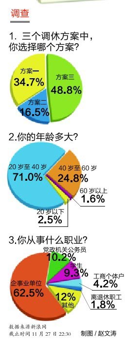 27日零时,全国假日办联合多家网站发布“法定节假日调休安排调查”。此次调查是继今年10月假日调查后,全国假日办第二次通过网络征集民众对放假方式的意见。此次调查提出三个调休方案供网民投票。