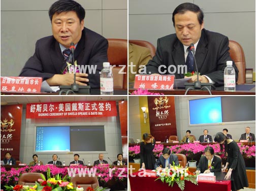 5月10日上午,山东五十强企业——日照舒斯贝尔与全球五百强、世界第一酒店管理集团——美国戴斯酒店集团合作签约仪式暨新闻发布会隆重召开,日照第一高度俯瞰全城、首个国际知名品牌酒店集团管理经营的特色主题化、四星级产权酒店——日照戴斯大酒店盛装亮相。日照市副市长张喜忱、日照市旅游局局长柏峰、日照电视台副台长王一海、美国胜腾集团副总裁Ben Ancher、美国戴斯酒店集团(中国)总裁陈嘉财出席签约仪式。张喜忱副市长、柏峰局长分别作重要讲话。