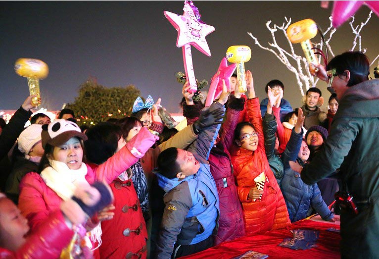2月14日晚,一群孩子在太阳广场2014春节游园会现场猜灯谜。“猜灯谜”即弘扬了中华民族传统文化,又让孩子们享受到浓浓的节日喜悦,受到家长和孩子的热烈欢迎。