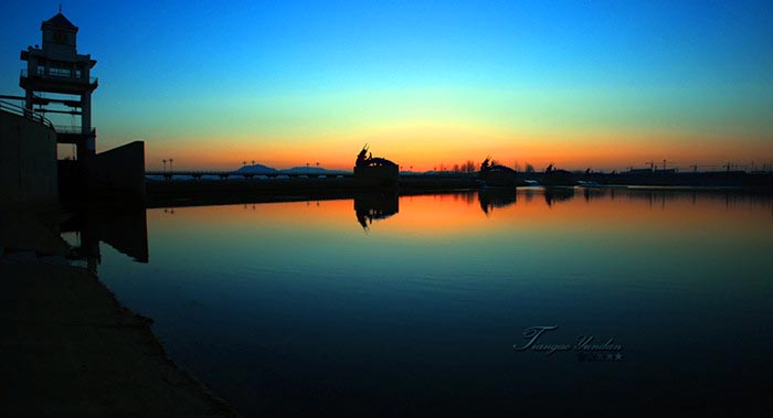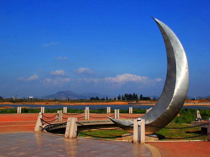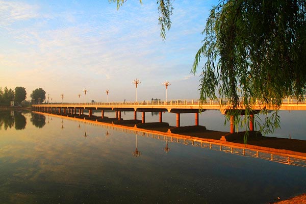 在这里可以尽情享受时空变幻所带来的自然之美。在清晨,水面上雾气缭绕,公园里云烟氤氲,宛若传说中的桃源;初旭升起时,柔和的光线轻轻的穿过薄薄似雾的水汽,人处西堤,会看见一架虹桥跃然河上,虹桥之后的远山朦胧中让人不禁生出几分遐思;残阳西斜时,人在东堤西望,一层淡淡的黄晕铺在景致之上,渐渐朦胧,水面上弯月如船般荡漾。尽享悠然之逸趣。好一个美丽的世外桃源。