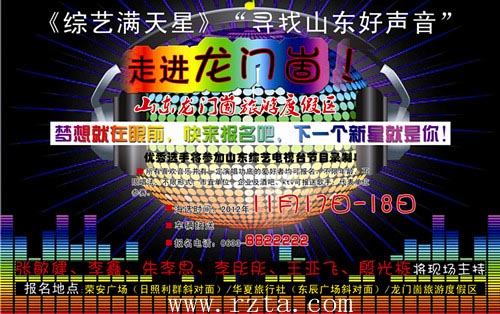 全民大精彩,敢唱你就来。 11月17—18日,李鑫、张敏健、李彤彤、王亚飞、殷光栋、朱李思携手山东综艺频道《山东好声音》走进龙门崮旅游度假区。《山东好声音》—咱山东人家门口的舞台,不限年龄,不限唱法,不限形式,只要你敢唱,所有喜欢音乐并有一定演唱功底的爱好者均可报名。综艺频道全程录播,晋级选手将进入《山东好声音》的复赛舞台,录制晋级比赛。《山东好声音》是龙门崮继《快乐大PK》之后,与山东综艺频道联手推出的又一新的全名互动活动,2012,全民都互动,共创大精彩,快乐大升级。