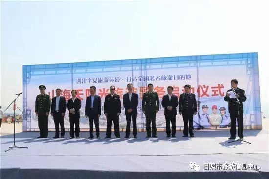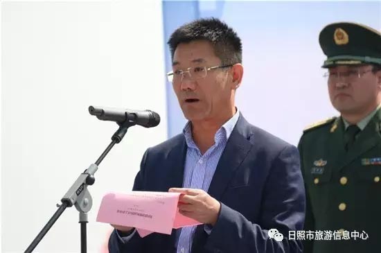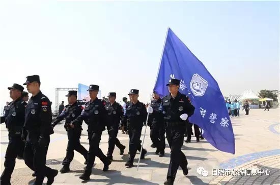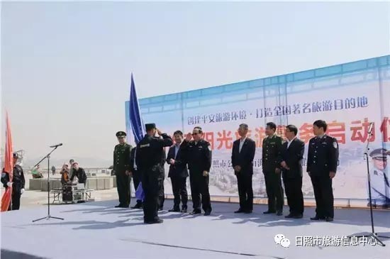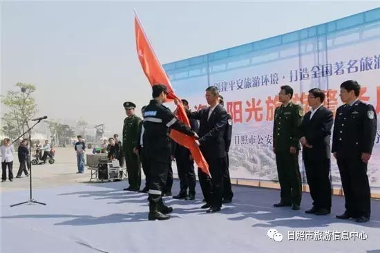 日照市公安局副局长曾宪威和日照市旅发委副主任禚磊分别为旅游警察和平安旅游志愿者授旗,并为山海天边防派出所阳光海岸旅游警务室揭牌。