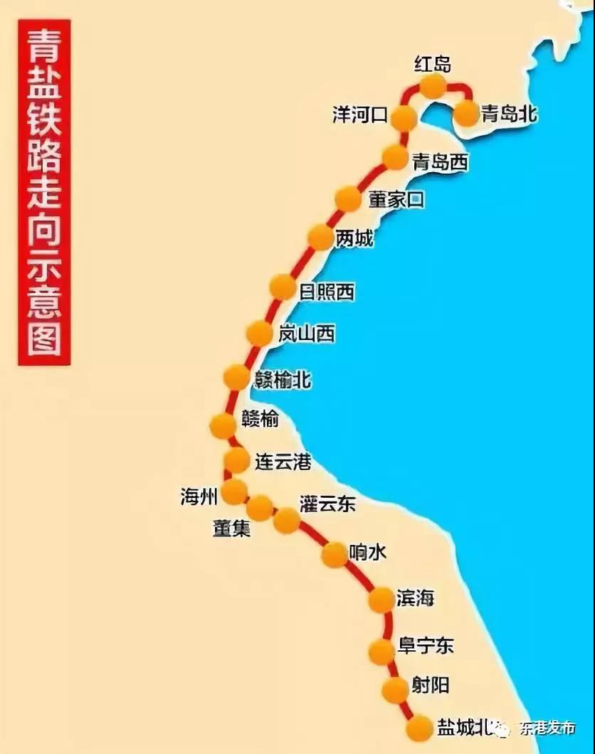 青盐铁路北起青岛北站、南至江苏境内盐城北站,线路全长428公里,其中山东境内186.6公里,为国铁I级客货共线铁路。山东境内共设红岛站、洋河口站、青岛西站、董家口站、两城站、日照西站、岚山西站7个车站。