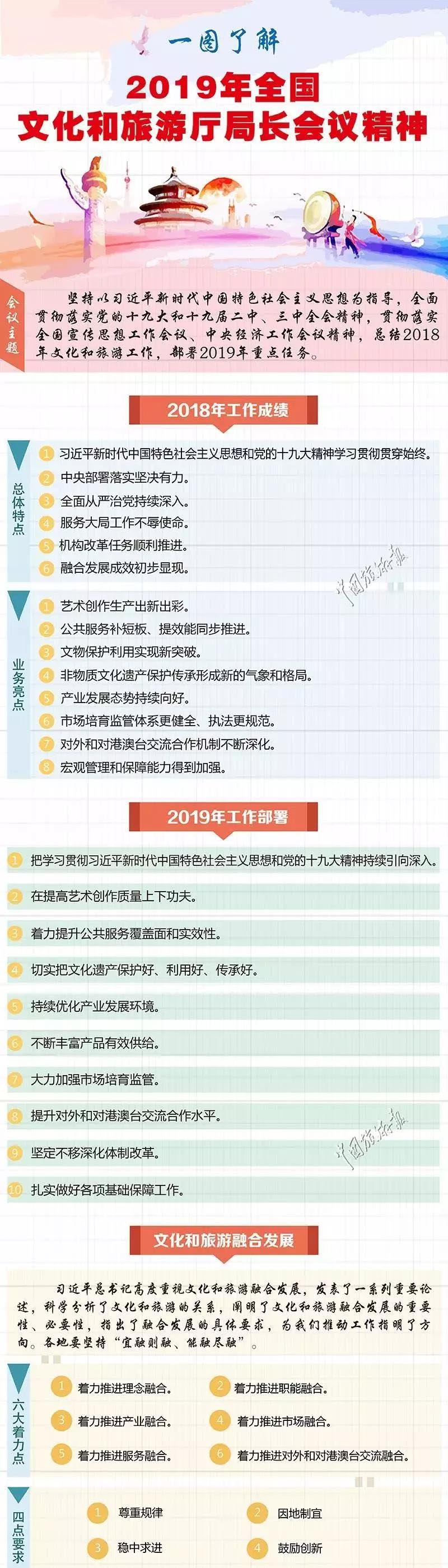 会议在部署2019年工作时强调,2019年是中华人民共和国成立70周年,是决胜全面建成小康社会第一个百年奋斗目标的关键之年。文化和旅游工作要把学习贯彻习近平新时代中国特色社会主义思想和党的十九大精神持续引向深入;在提高艺术创作质量上下功夫;着力提升公共服务覆盖面和实效性;切实把文化遗产保护好、利用好、传承好;持续优化产业发展环境;不断丰富产品有效供给;大力加强市场培育监管;提升对外和对港澳台交流合作水平;坚定不移深化体制改革。与此同时,要扎实做好各项基础保障工作。