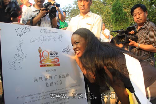 巡游期间,来自俄罗斯、日本、巴西、新加坡、英格兰等八十几个国家的世界旅游小姐们,走进风光俊美的五莲山,感受到了佛教文化的博大精深。走进奇峰怪石的九仙山,领略到了峦峰叠翠,松涛阵阵的秀美风光。巡游中,80多名世界旅游小姐在“向世界推广五莲山”美丽宣言板上签名,并承诺将以旅游大使的身份向全世界宣传推广五莲山,把日照五莲山的魅力形象展现给全世界。在五莲山、九仙山景区看到处处都是天然原生态的美景和栩栩如生的奇峰异石,佳丽们深深地陶醉其中,她们纷纷拿出照相机不停地拍照,将这异国他乡的美丽的景色留作永存。美景配美人,美人靓美景,此次巡游活动,既展现异国他乡的多彩风情,又为五莲时尚文化加入异乡情调,更为景区平添了更瑰丽的色彩,让美丽赋予了更丰富的内涵。世界旅游小姐们的风采不仅吸引着众多摄影师为她们争相拍照,而且还吸引了慕名而来的游客前来合影。