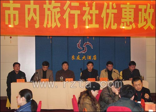 1月25日,2008年全市旅行社恳谈会暨刘家湾赶海园、竹洞天风景区门票政策发布会在良友大酒店举行。市旅游局副局长赵志超,东港区副区长姜毅,东港区旅游局局长肖建华、出席会议并讲话。会议由东港区旅游局副局长石强主持。