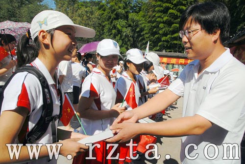 在景区的入口,当工作人员把鲜艳的五星红旗发到孩子们手中的时候,他们显得格外高兴,边走边兴奋的挥舞着红旗。在景区门口的广场,竹洞天景区总经理张良团还代表景区向孩子们赠送了著名儿童诗人尹世霖先生的诗集《字字春风》和《教师光荣》,勉励孩子们好好学习,长大以后为建设美好家园贡献自己的力量。