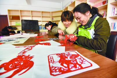 1月14日,东港区秦楼街道新城社区的居民正在制作剪纸作品。