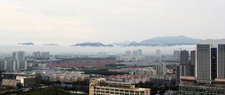 9月1日,一阵秋雨过后,日照高新区上空出现罕见的平流雾奇观,部分区域雾气缠绕,宛如仙境。